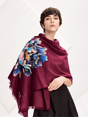 作品以牡丹花為紋樣,加以漳絨剪花的工藝和純手工縫珠繡法,精致的點綴了蠶絲厚織圍巾。搭配各種服飾都能凸顯優雅與沉穩氣質,在秋冬給人以溫暖之感。